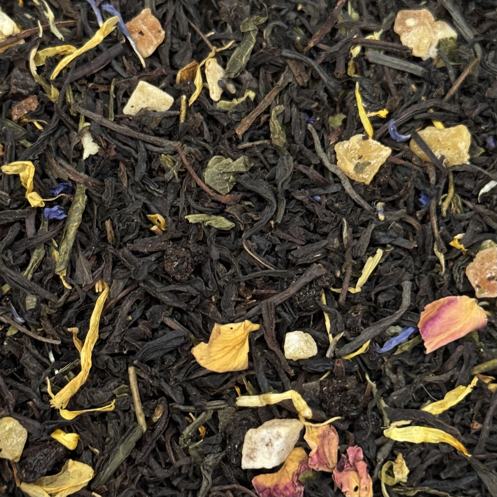 Купаж отборного черного и зеленого чая с кусочками папайи, лепестками розы и василька, цветами мальвы и бархатцев. Заваренный настой медового цвета имеет легкий фруктово-ягодный аромат и вкус.