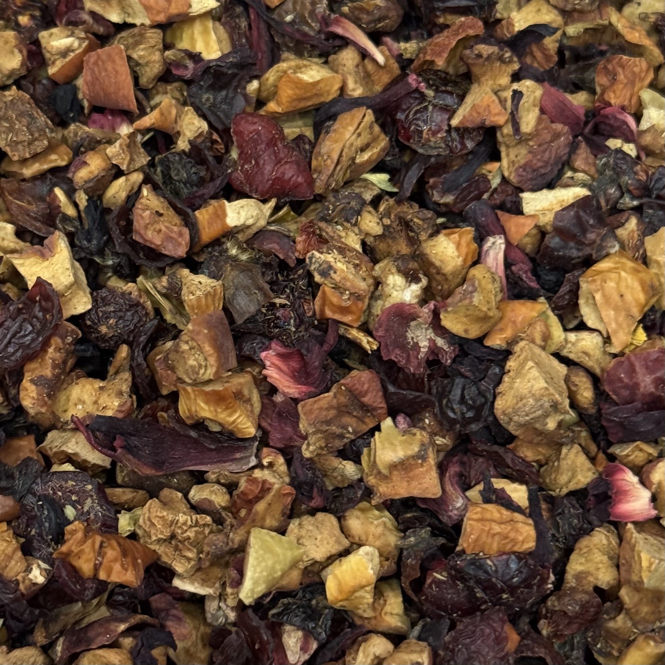 Фруктовая смесь с добавлением кусочков яблока, ягод шиповника, бузины, вишни, лепестков подсолнуха, гибискуса и календулы, экстракта ацеролы (барбадосской вишни). При заваривании получаем ярко-рубиновый настой с насыщенным вишневым вкусом.