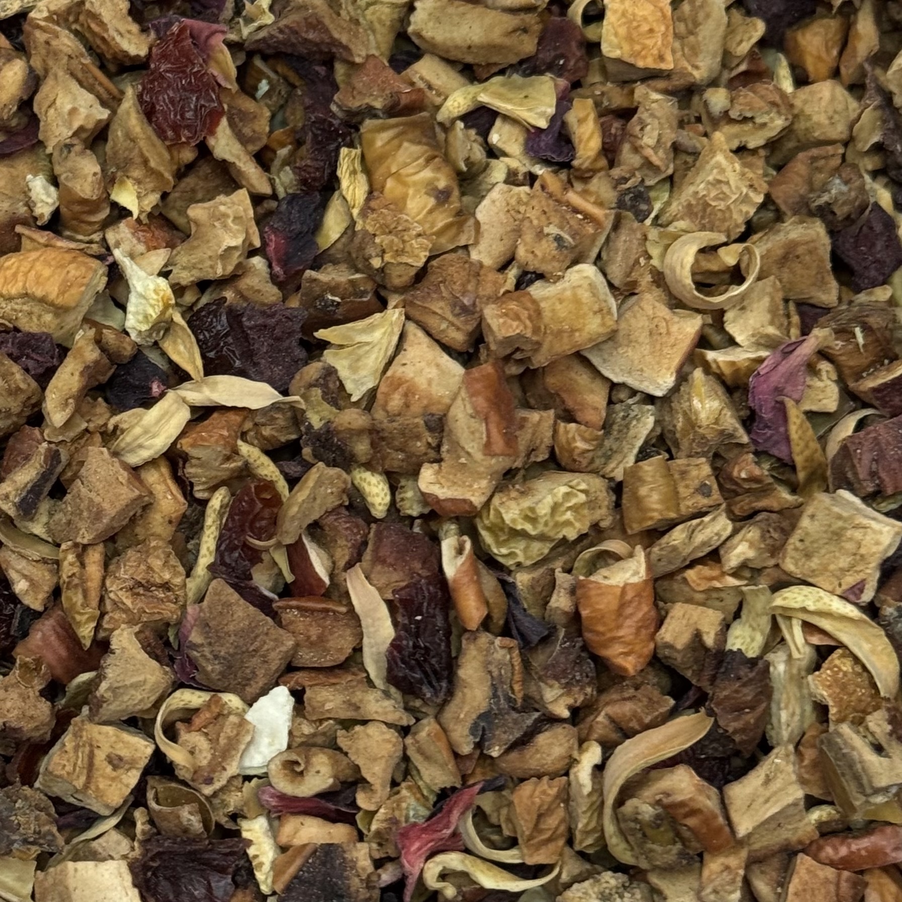Фруктовая смесь с добавлением кусочков яблока, корня свеклы, корочек апельсина, ягод шиповника, лепестков гибискуса, розы, долек и соцветий апельсина, цветов граната и подсолнуха.