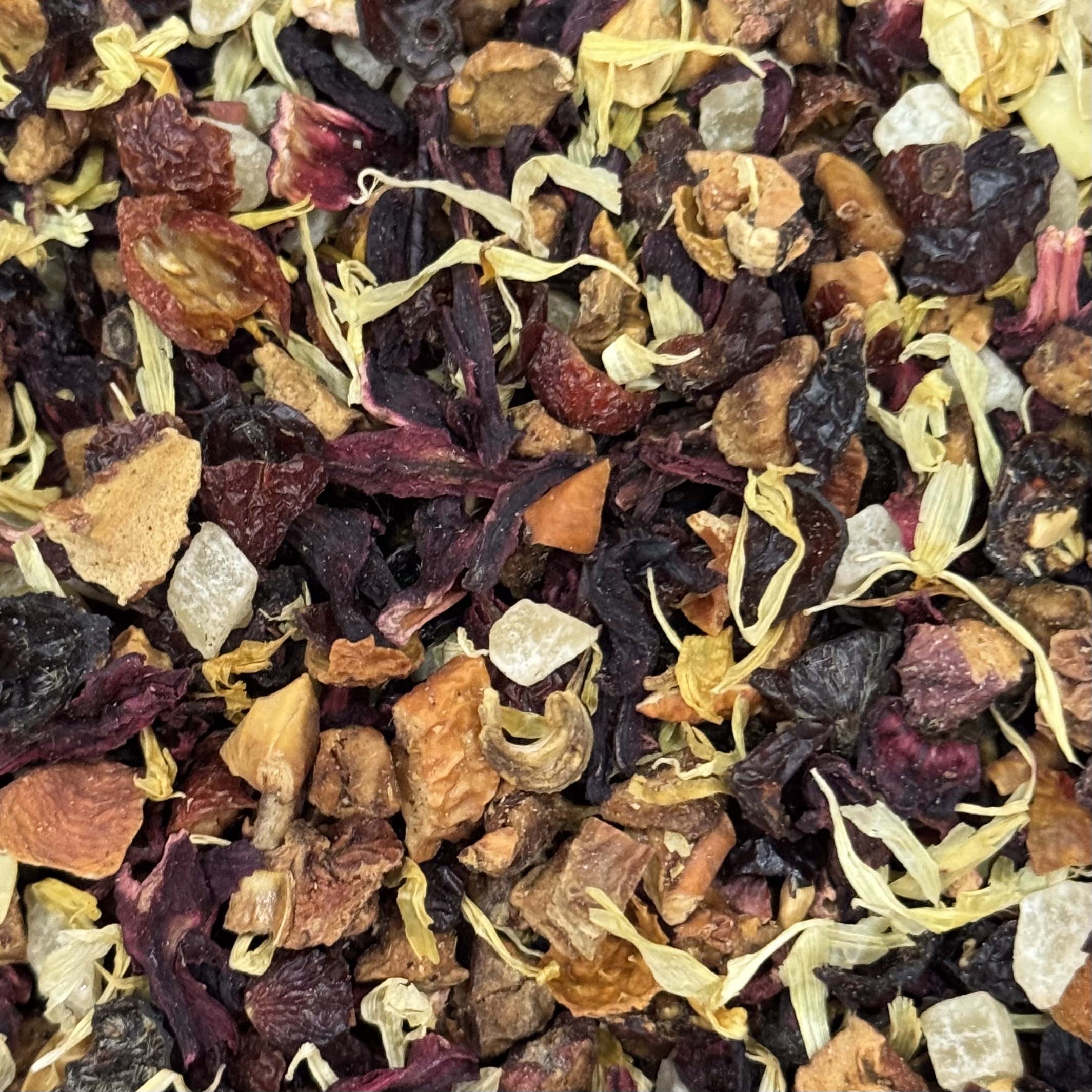 Фруктовая смесь с гибискусом, шиповником, кусочками яблок, груши и ананаса, клюквой, кусочками имбиря, миндалем, лепестками календулы. Настой имеет пикантный вкус груши и имбиря.