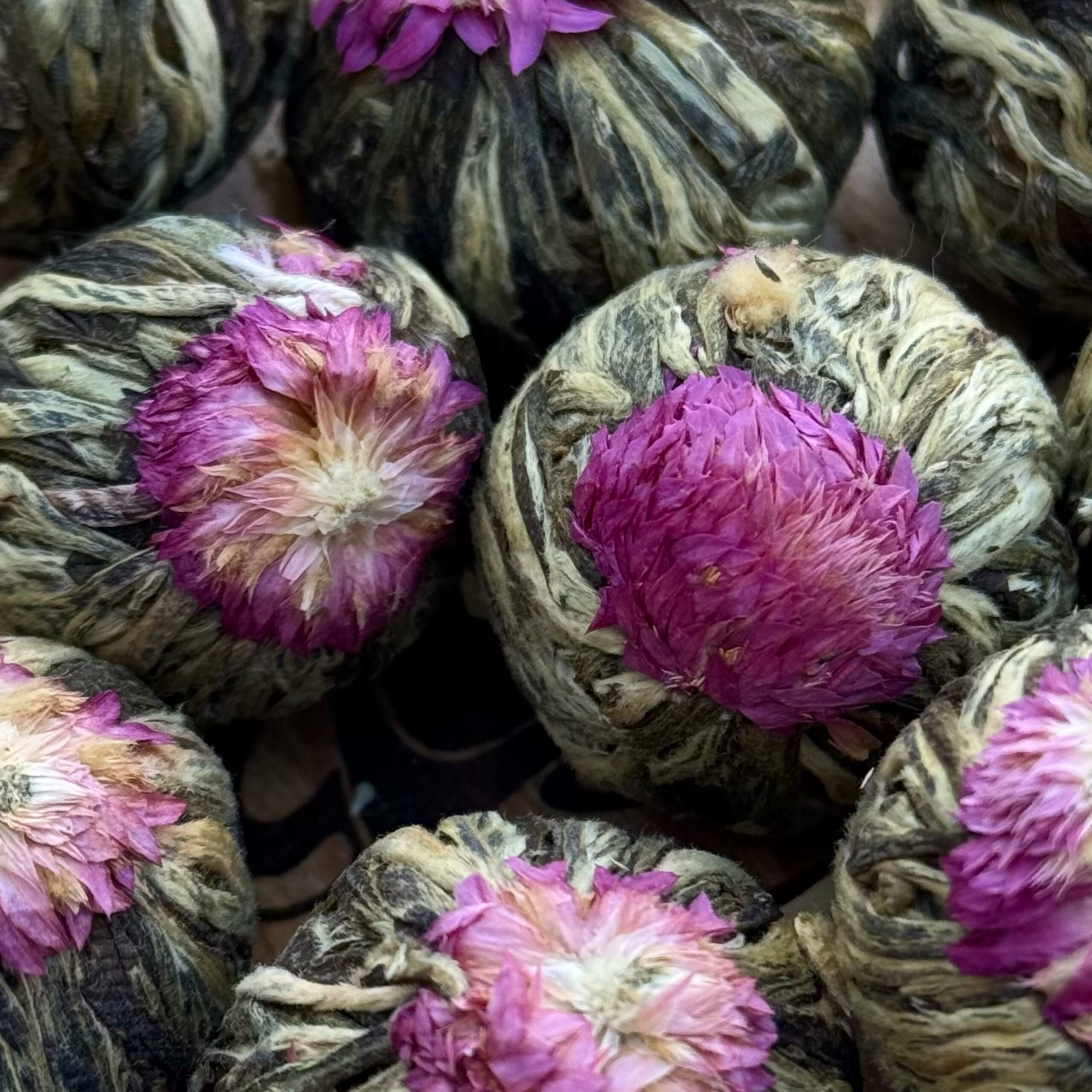 Связанный зеленый чай, который при заваривании раскрывается в виде цветка с амарантом внутри.