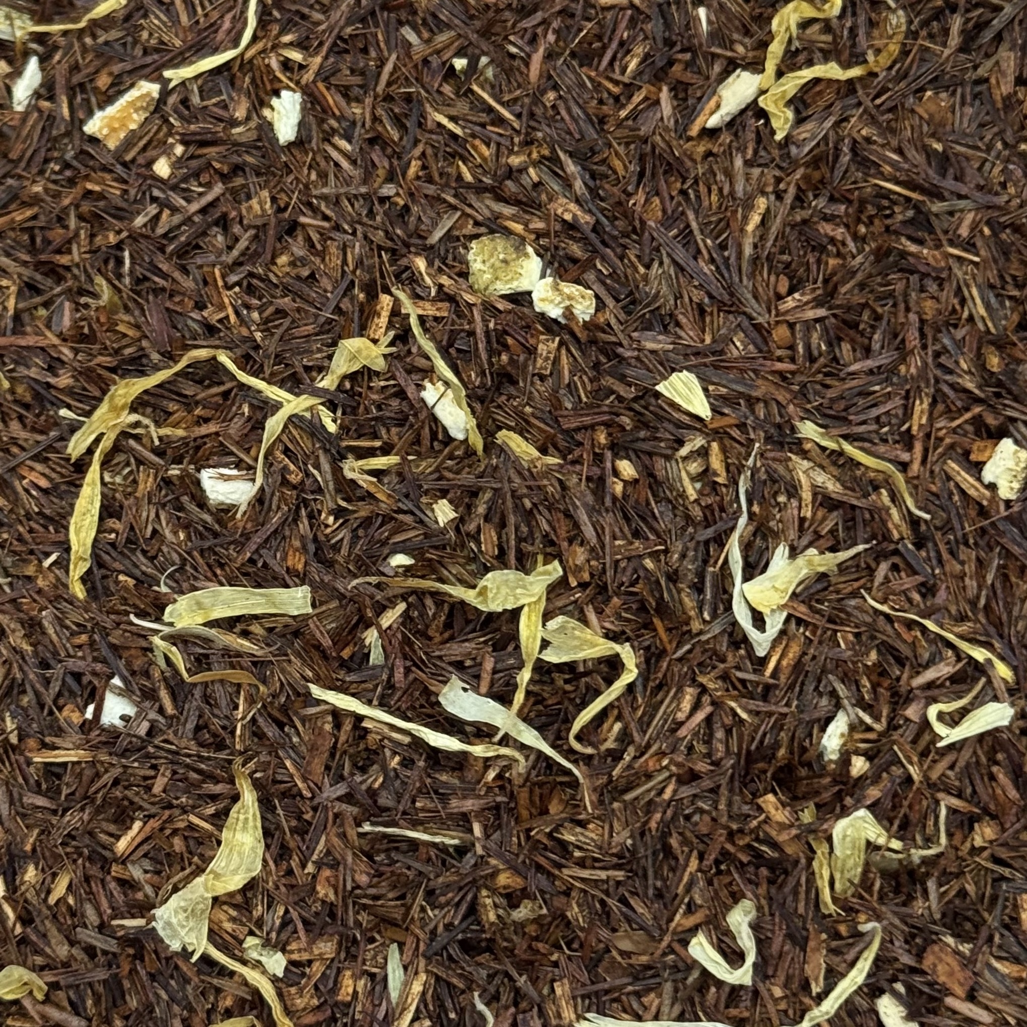 Смесь из листьев и стеблей южноафриканского кустарникового растения ройбуш с лепестками подсолнуха и корочками апельсина.