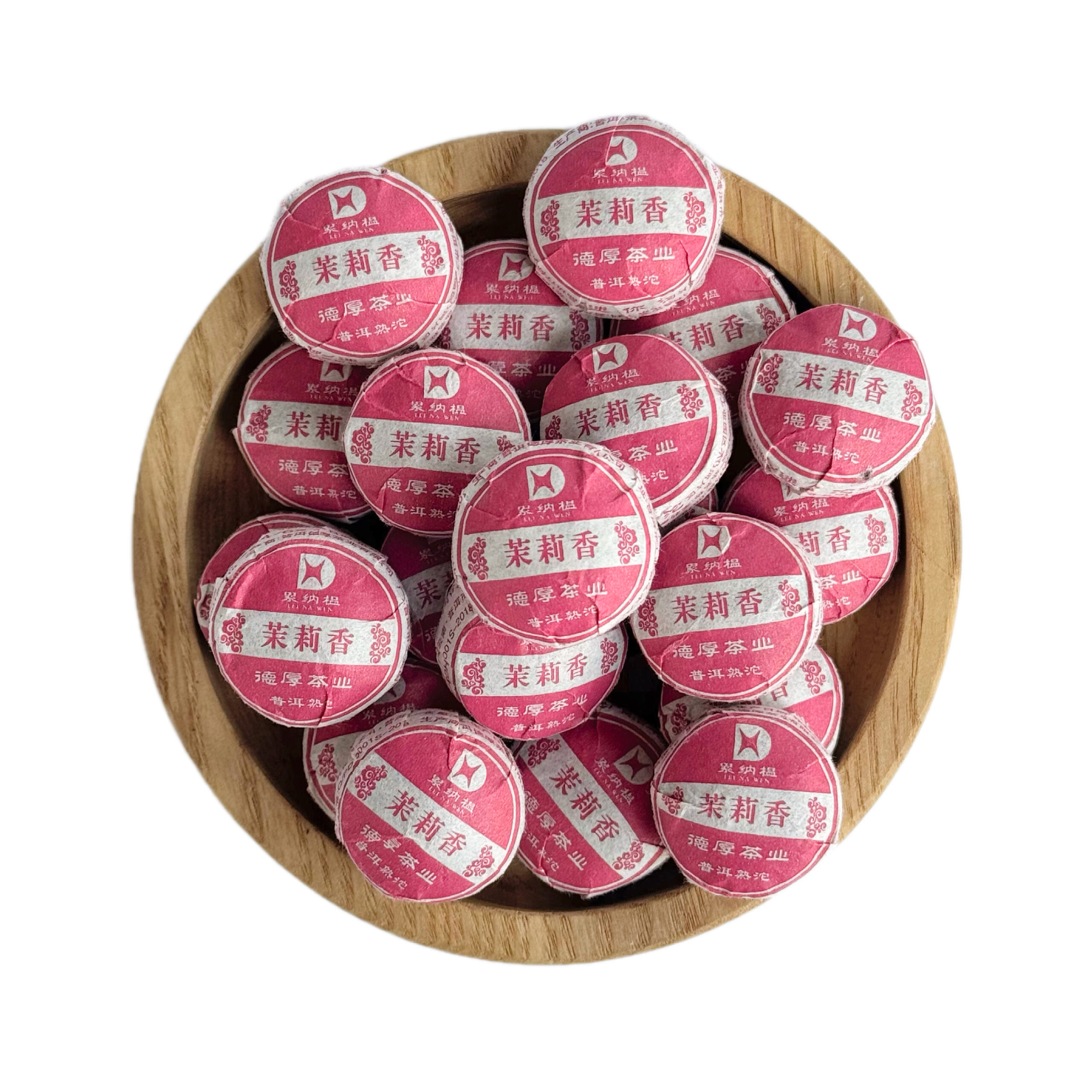Этот чай представляет собой сочетание нежного аромата жасмина с насыщенным вкусом шу пуэра. В каждой мини точа находится настоящее удовольствие для чаепития. Каждая точа имеет диаметр около 2,5 см и упакована в индивидуальную фольгированную обёртку, что позволяет сохранить свежесть и аромат чая.