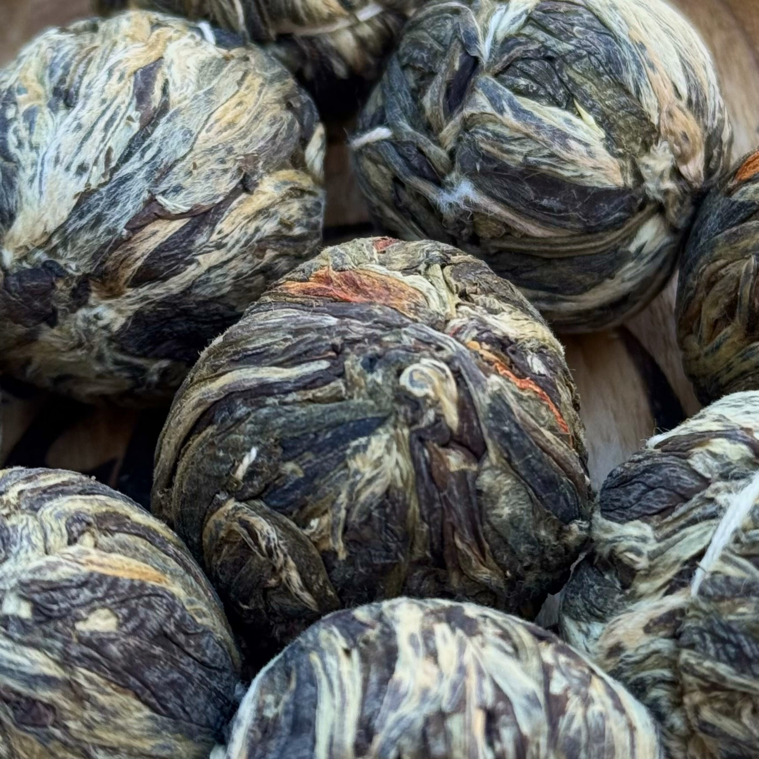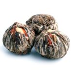 Великолепный связанный зеленый чай в форме персика с молодыми свежими почками чайного куста. Внутрь шарика чая помещены цветы хризантемы, амаранта и жасмина, которые при заваривании образуют великолепную композицию в виде корзины с венком.