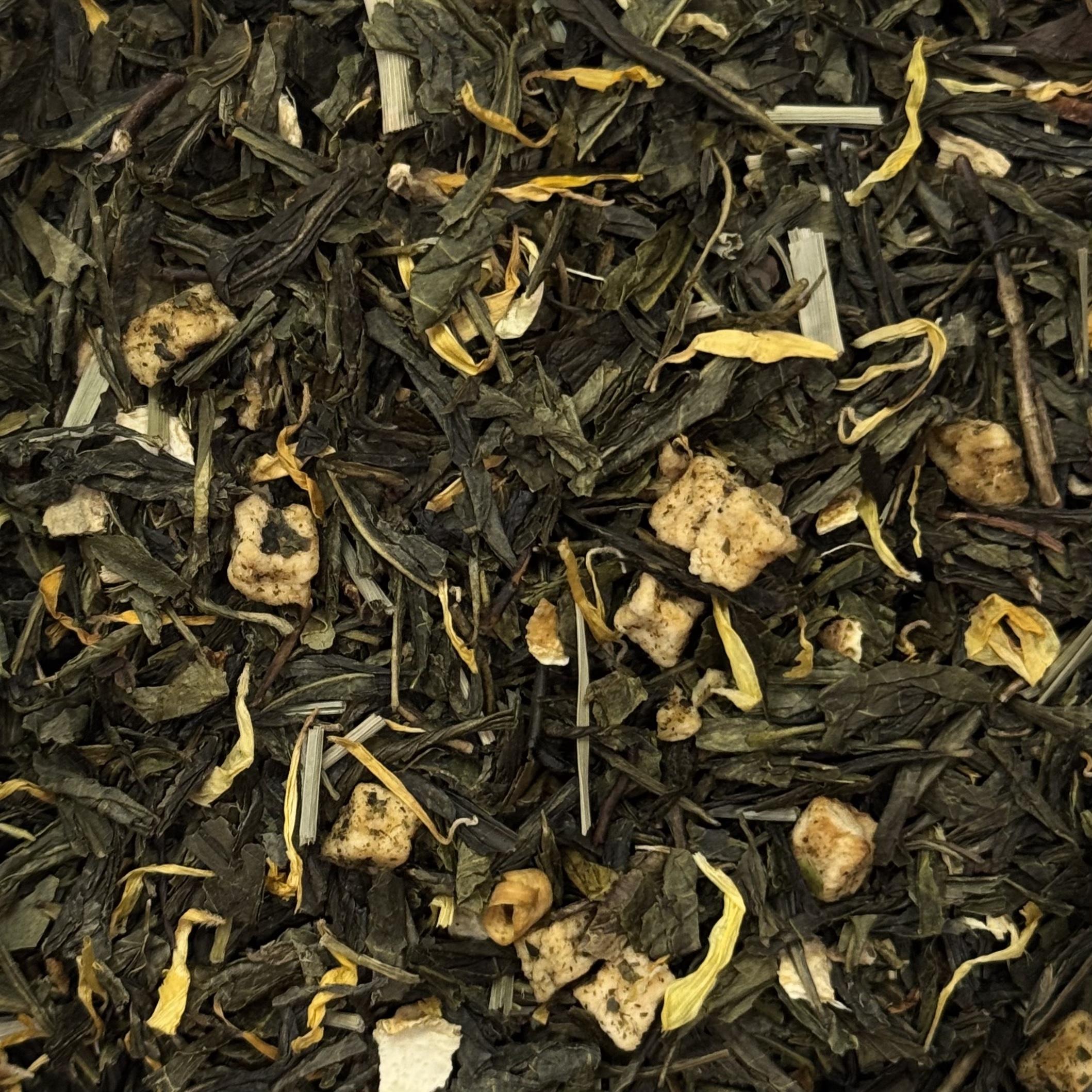 Оригинальное сочетание зеленого чая со слайсами имбиря, цедрой апельсина, цветами османтуса, лимонной травы, яркими лепестки подсолнуха и лимонного мирта.